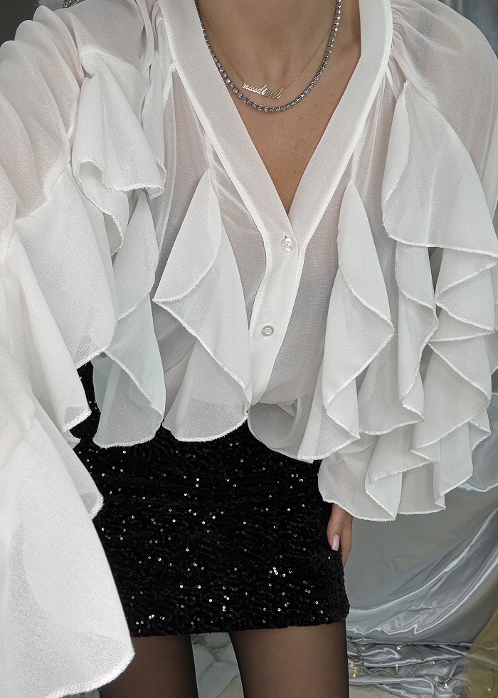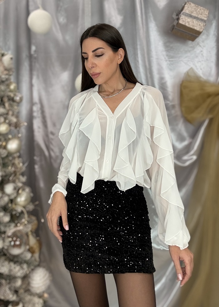 Αέρινο και κομψό πουκάμισο από ελαφρύ σιφόν ύφασμα, με εντυπωσιακά βολάν στο μπροστινό μέρος που χαρίζουν θηλυκότητα και κίνηση.