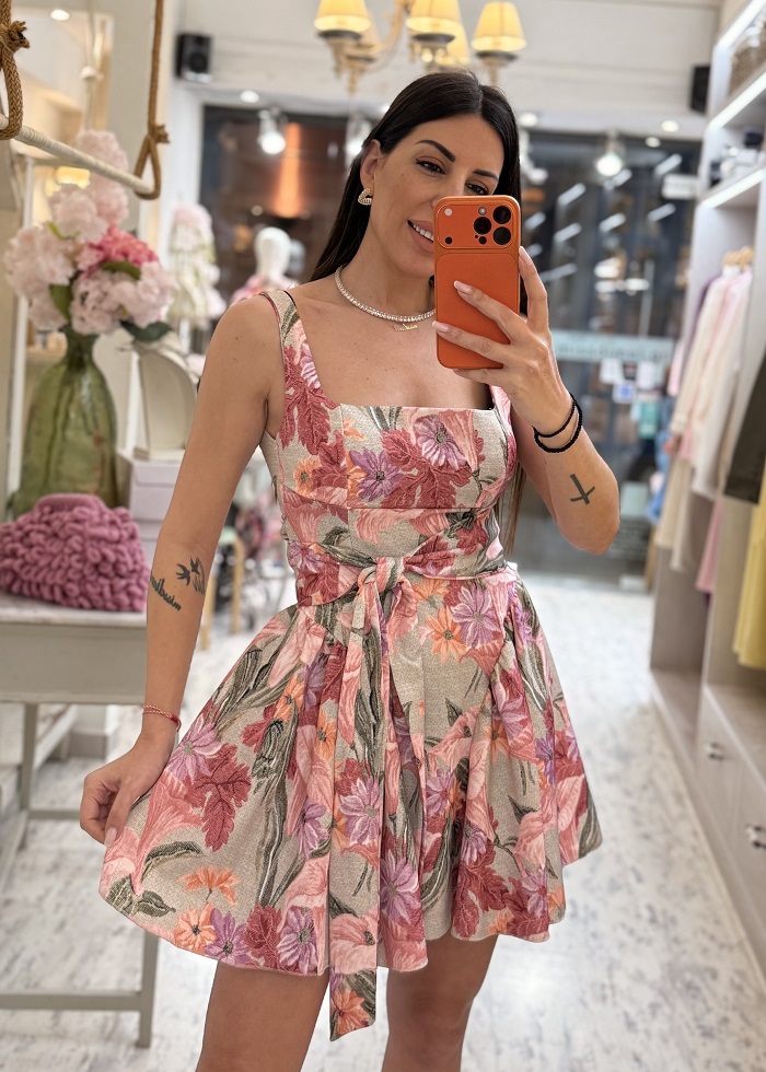 Θηλυκό mini φόρεμα με ρομαντικό φλοράλ μοτίβο σε απαλές αποχρώσεις ροζ και κοραλί.