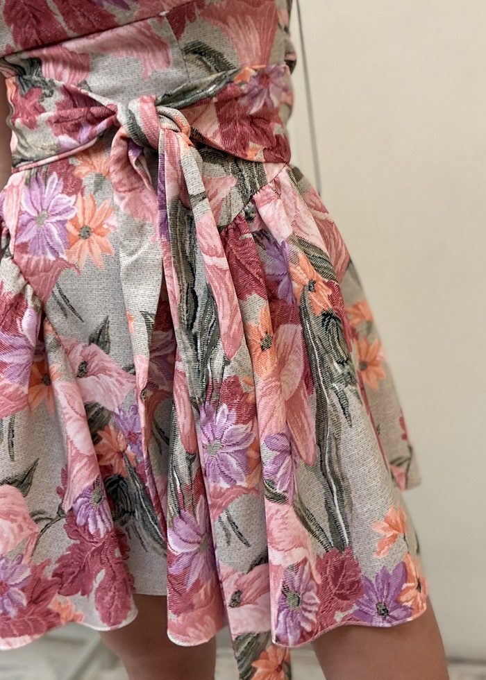 Διαθέτει τιράντες, τετράγωνο ντεκολτέ, ανοιχτή πλάτη  και ζώνη στη μέση που τονίζει τη σιλουέτα, ενώ η φούστα με όγκο χαρίζει κίνηση και κομψότητα.