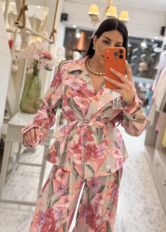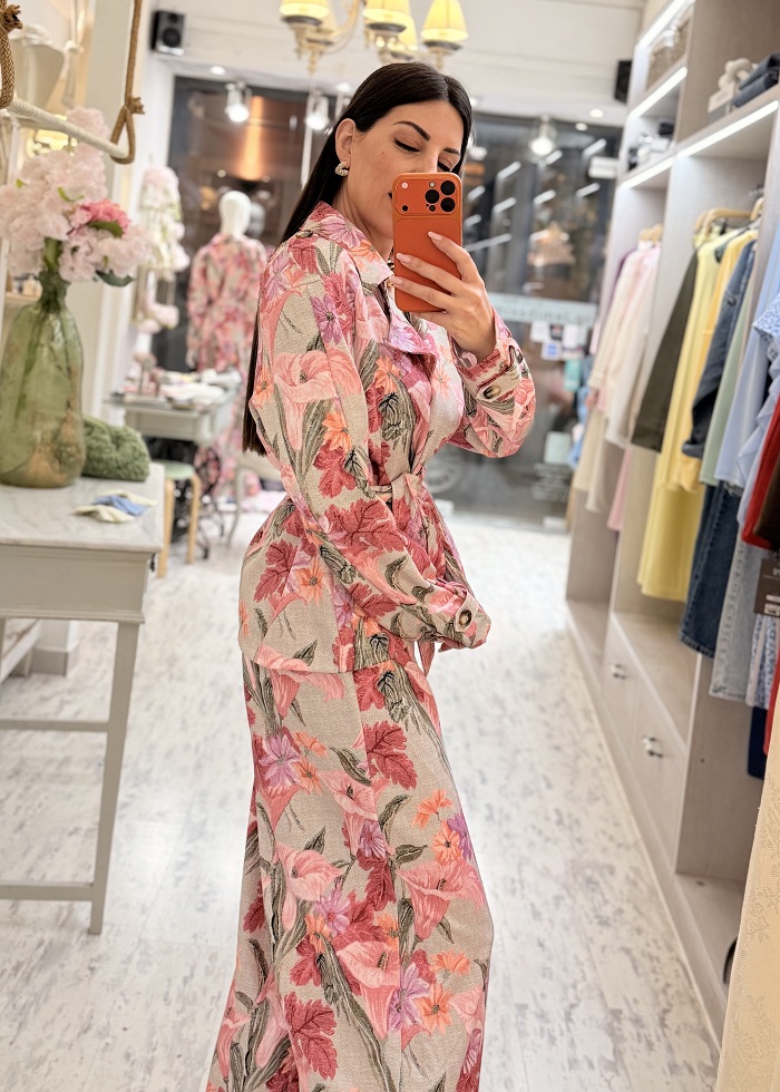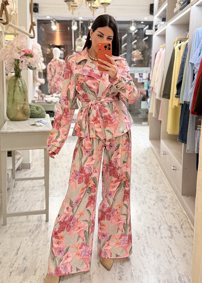 Εντυπωσιακό σετ δύο τεμαχίων με ρομαντικό φλοράλ μοτίβο σε αποχρώσεις ροζ, κοραλί και μωβ πάνω σε μπεζ βάση.