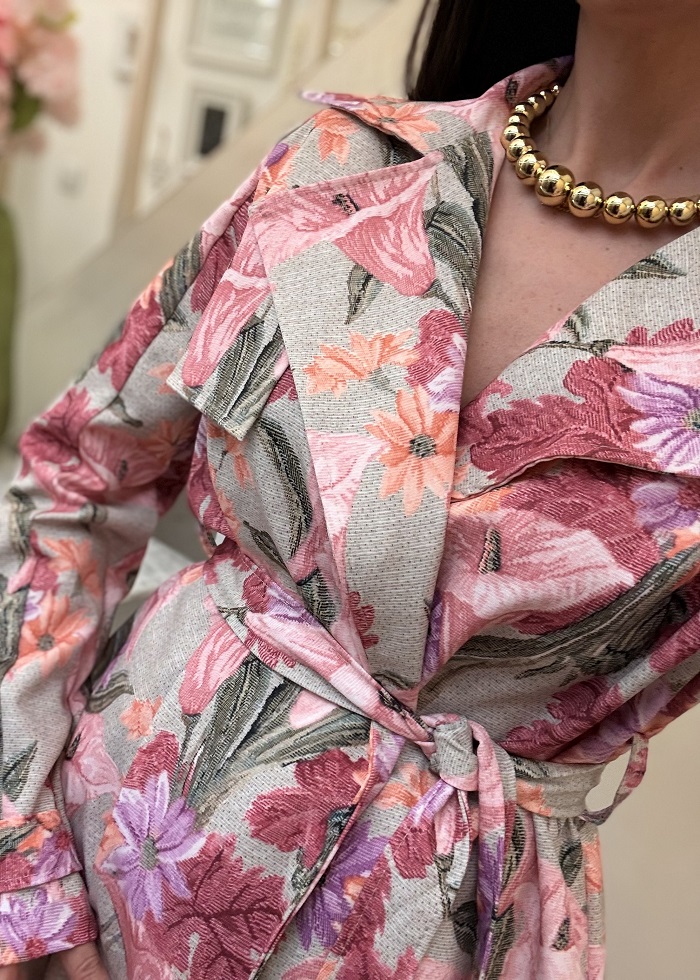 Η καπαρντίνα διαθέτει κλασικό γιακά, κουμπιά μπροστά και ζώνη στη μέση που αναδεικνύει τη σιλουέτα και προσθέτει κομψότητα στο σύνολο.