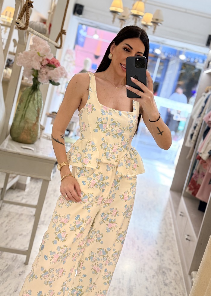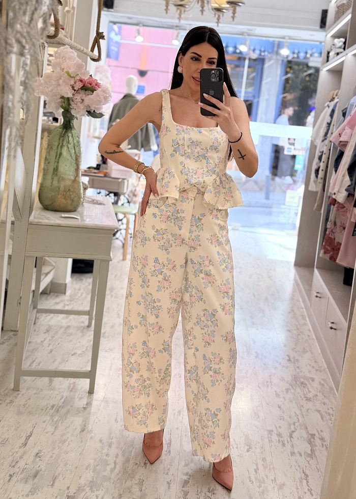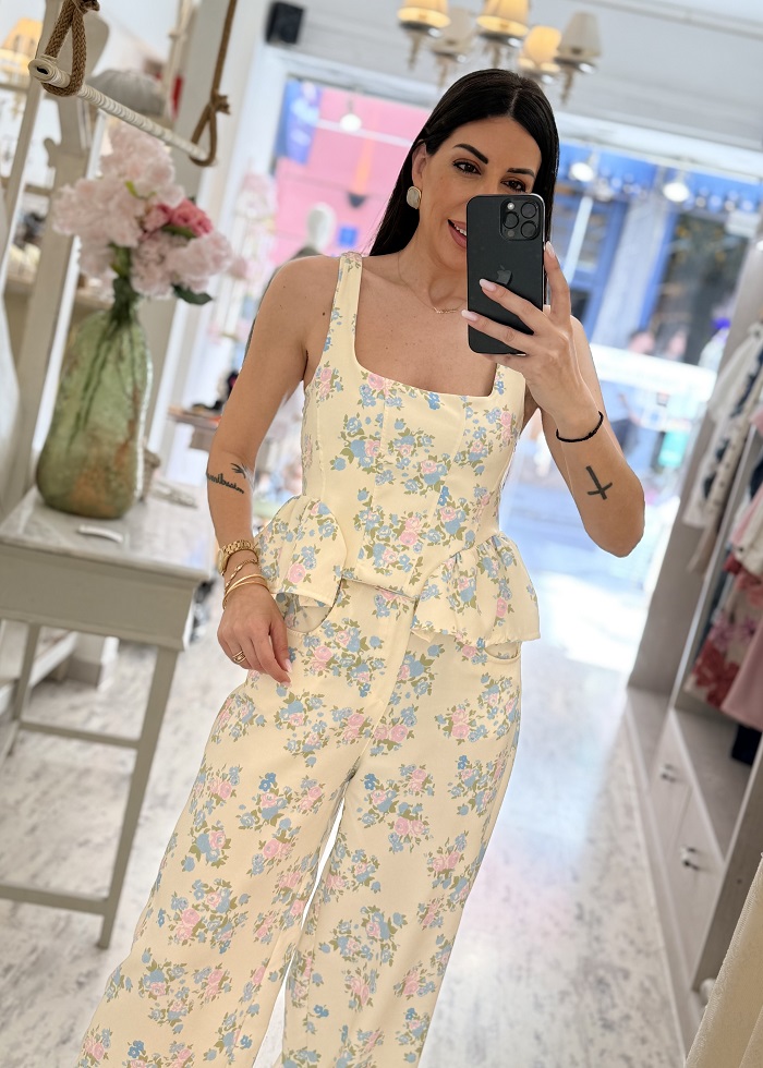 Το σύνολο αποτελείται από crop top με τιράντες και διακριτικό peplum τελείωμα που αγκαλιάζει τη μέση, χαρίζοντας θηλυκή γραμμή, και ψηλόμεσο παντελόνι σε άνετη, balloon γραμμή που προσφέρει κομψότητα και άνεση όλη μέρα.