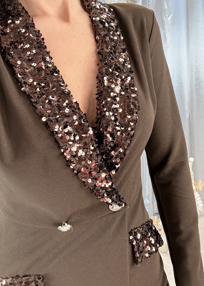 Αναδείξτε το στυλ σας με αυτό το εντυπωσιακό mini σακάκι – ολόσωμο σορτς σε μοντέρνα σοκολά απόχρωση.