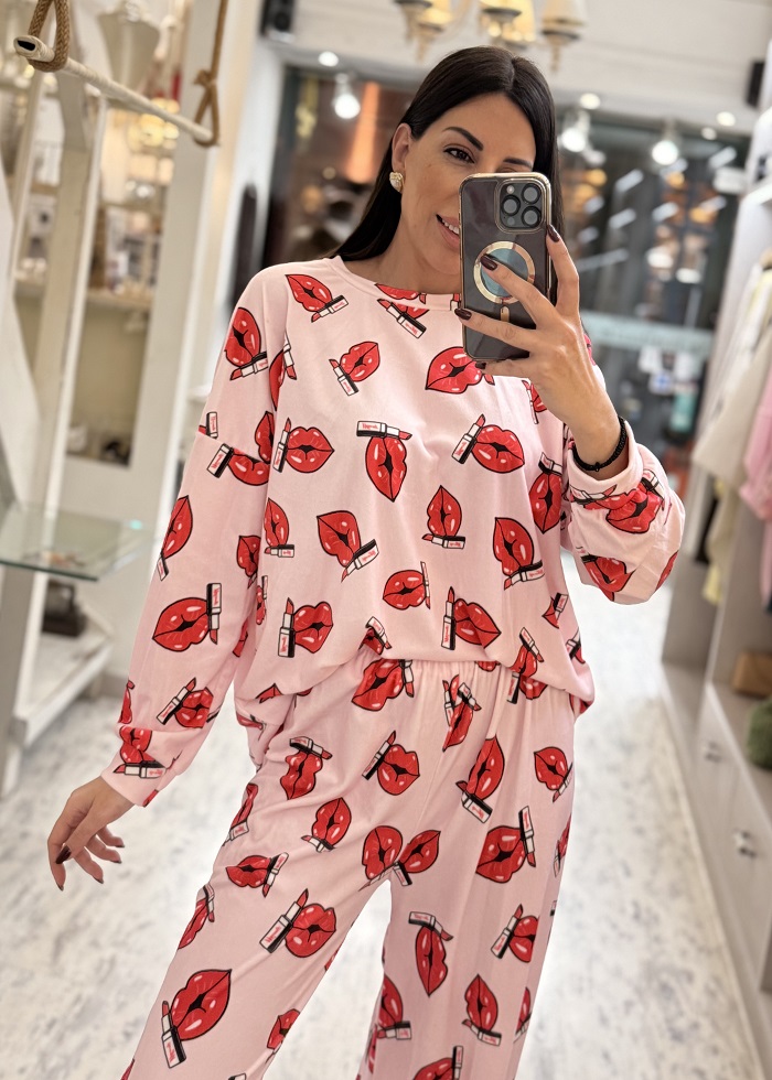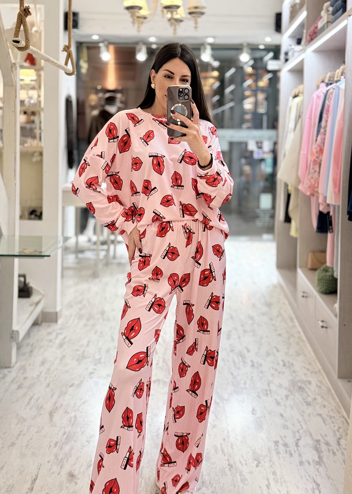 Διαθέτει άνετη μπλούζα με μακριά μανίκια και παντελόνι σε χαλαρή γραμμή με λάστιχο στη μέση.